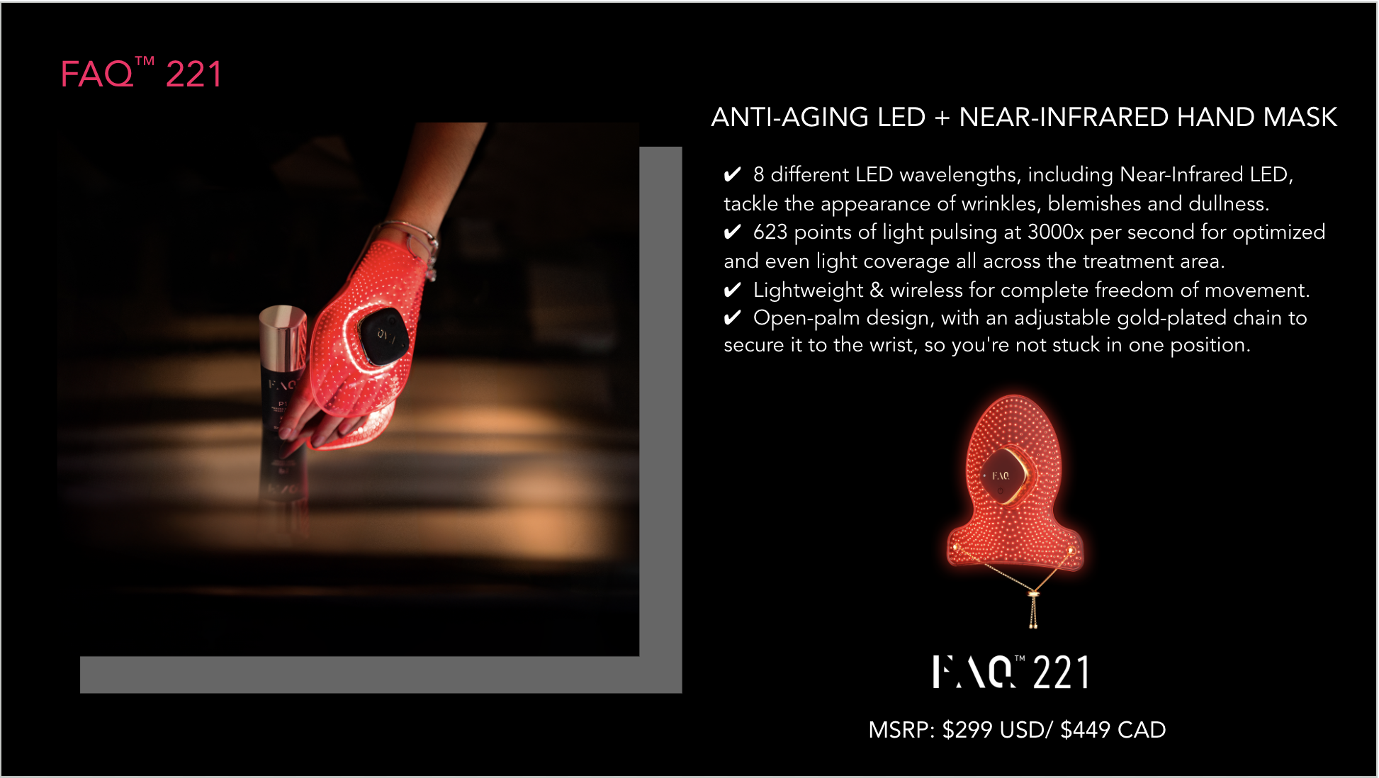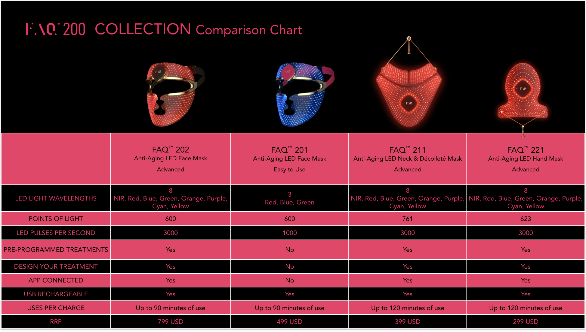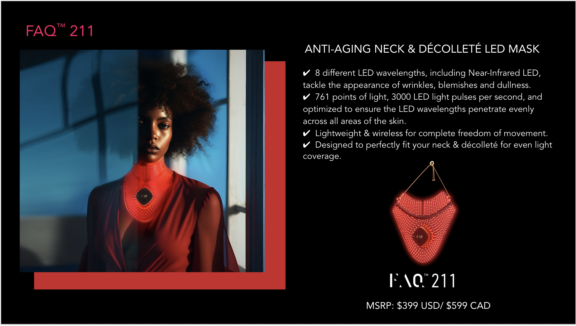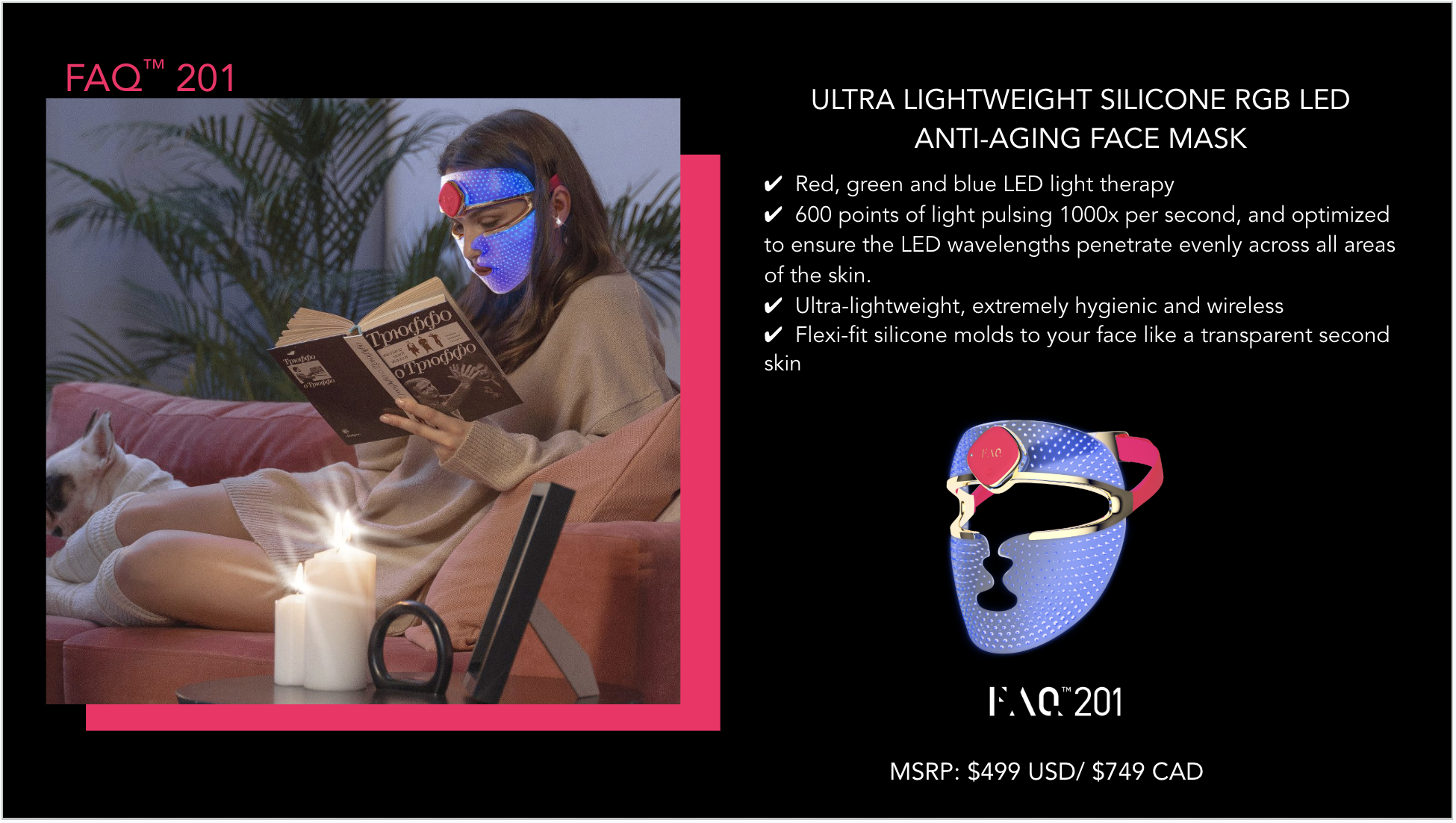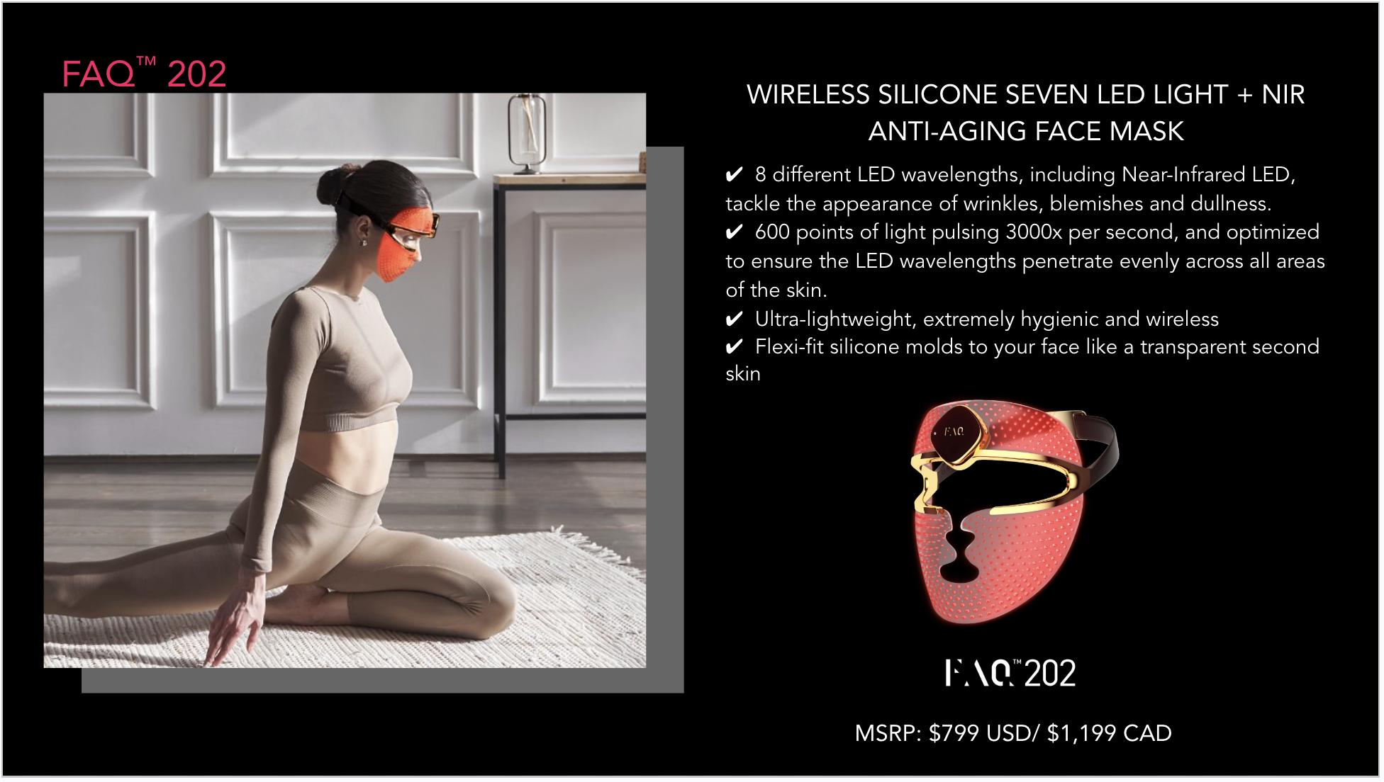 Introducing an entirely new generation of LED masks. Ultra-lightweight, wireless, and made with flexi-fit silicone to mold to your facial contours for even light coverage. FAQ™ 202 features 8 different wavelengths, including NIR (near-infrared), to tackle signs of aging and other skin concerns – while you do literally anything else. Move around freely, and enjoy spa-level LED facial treatments, at the push of a button.