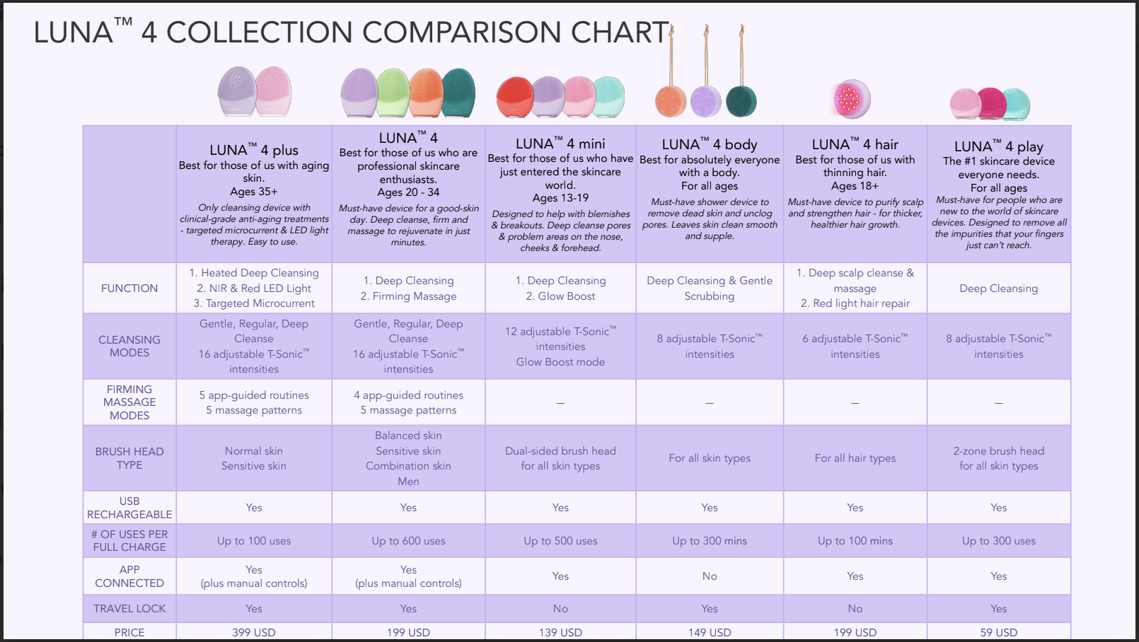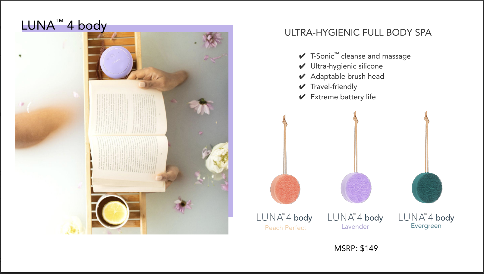 Meet LUNA™ 4 body – your travel-friendly massaging body brush. A gentle, T-Sonic™-powered skin care device visibly softens, smooths & firms as you indulge in a profoundly purifying full body spa. The highly adaptable, ultra-hygienic silicone brush head respects your individual curves – flexing inwards like a sponge – to accommodate all various bodily contours.
